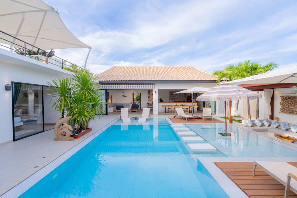 Luxurious sun loungers positioned along the pool, perfect for soaking up the sun. Additionally, there are in-water sun loungers elegantly placed within the shallow section of the pool, offering a unique and refreshing lounging experience.